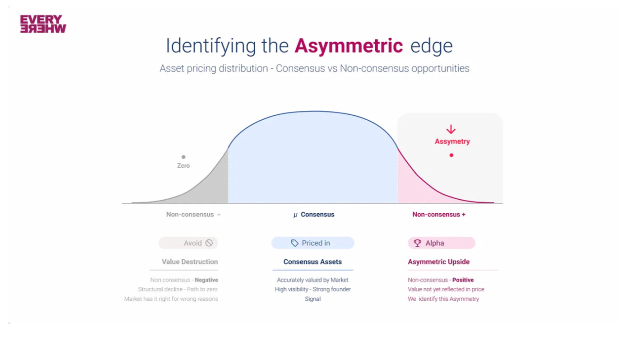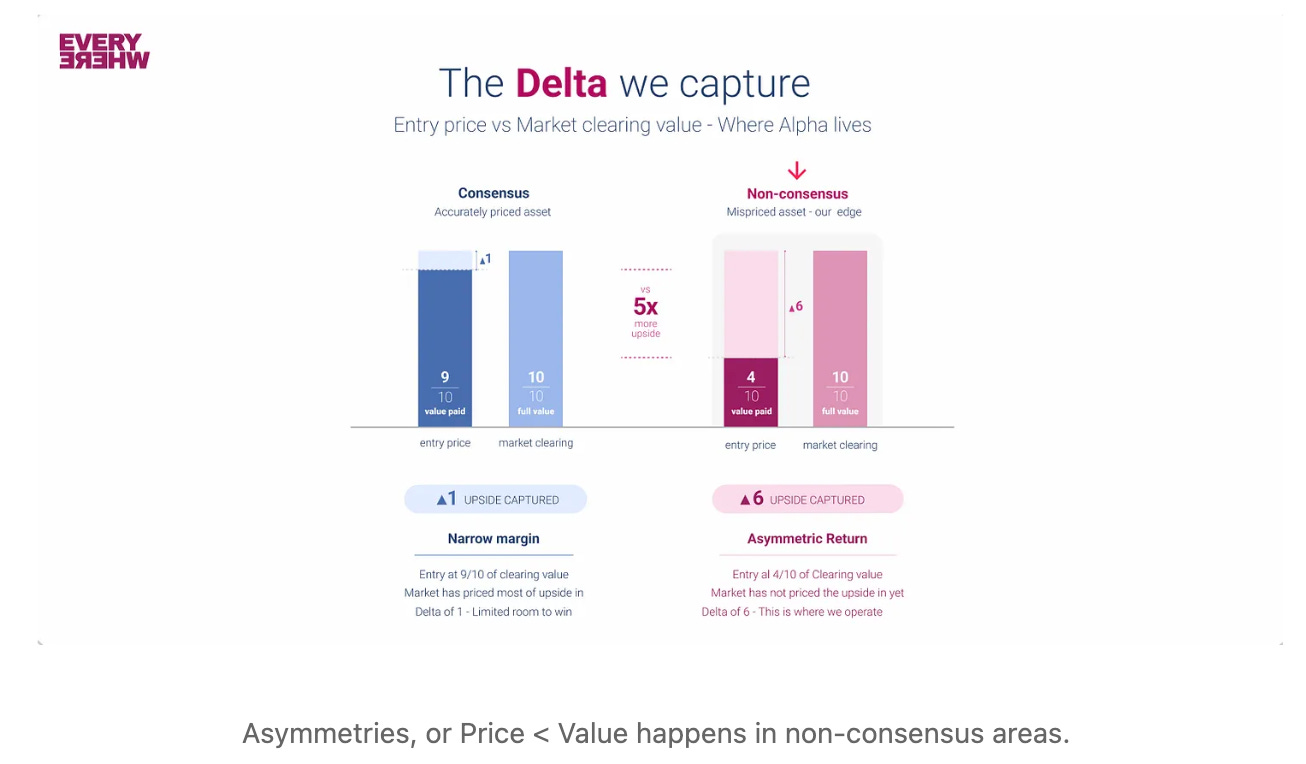 At Everywhere Ventures we ourselves are a non-consensus firm. We’re bicoastal, we’re very early pre-seed, we primarily invest outside of the Bay Area gold rush. But what we believe is that our network of 1,000 founders as LPs and portfolio CEOs give us unfair access into these tails via compounding network effects in venture capital. And because we constantly evaluate “where the tail is,” whether sector, geography, or founder archetype, we’re focused on finding these mis-priced assets in the market. We write three times more checks than firms our size, and we return capital. We’ve charted to the top decile every fund, every cohort, every year for the last decade.