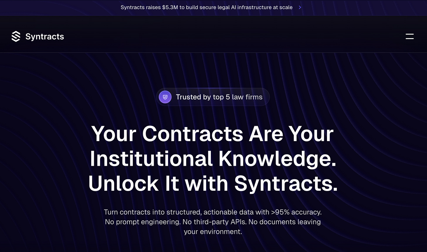 Most legal AI startups may be rushing to the cloud, but Syntracts is taking the opposite route and they just landed $5.3M to prove why that matters. Founded by Douglas Bemis (former CTO at Uber AI Labs) and Christopher Martin (ex–Latham & Watkins), Syntracts is building a privacy-first, on-prem infrastructure layer that integrates directly into a firm’s existing workflows. It’s not another point solution or shiny front-end tool—it’s a secure API that transforms messy contracts into structured data, ready for use across dashboards, document systems, and AI assistants. All while staying behind the firm’s firewall.