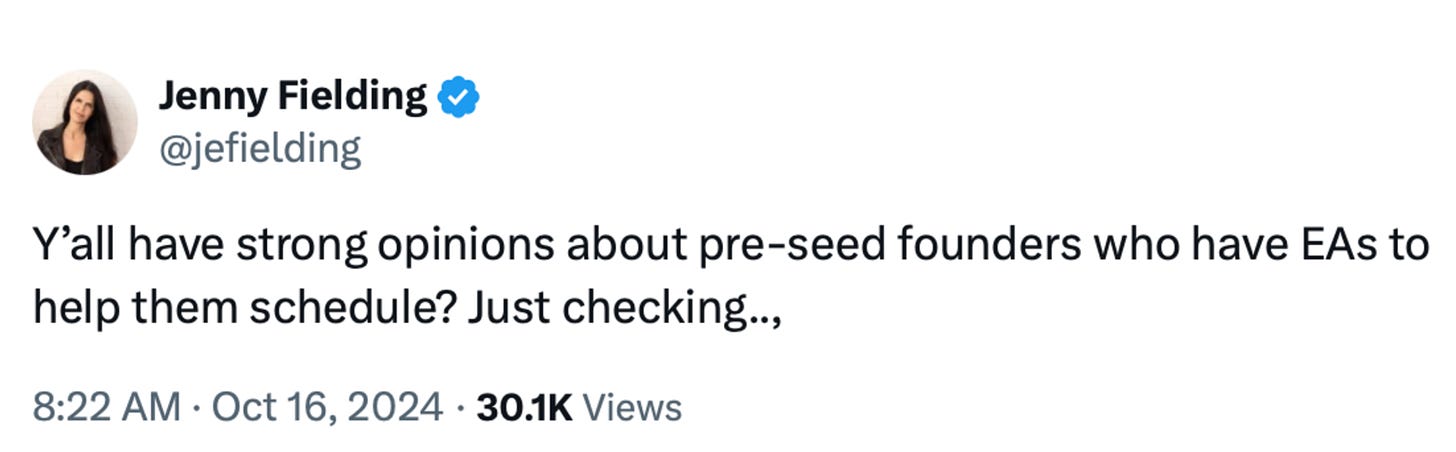 In a cash constrained venture market where every dollar counts, investors want to feel confident that their cash is being spent on critical things that move the business forward - rather than nice-to-have extras long associated with the excess of the bull market. One of those perceived ‘extras’ at the early stage is an executive assistant that helps with scheduling and other administrative tasks. Jenny Fielding, co-founder of Everywhere Ventures recently sparked a lively debate on X (formerly Twitter) with a simple but snarky post: